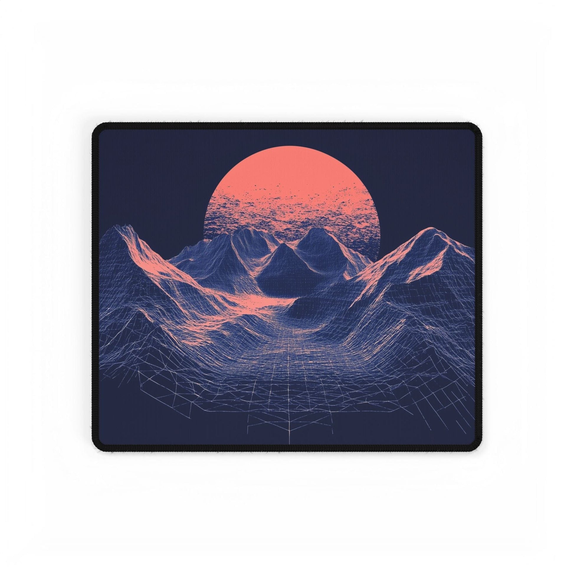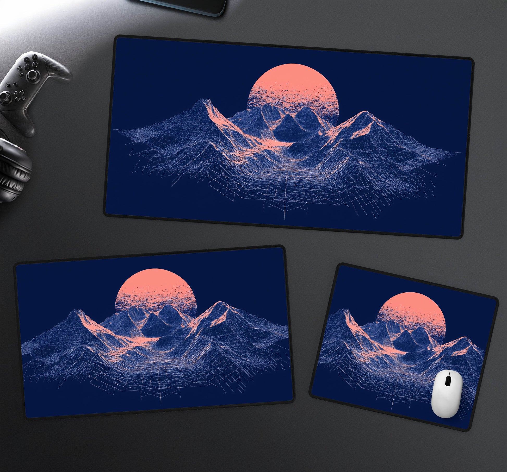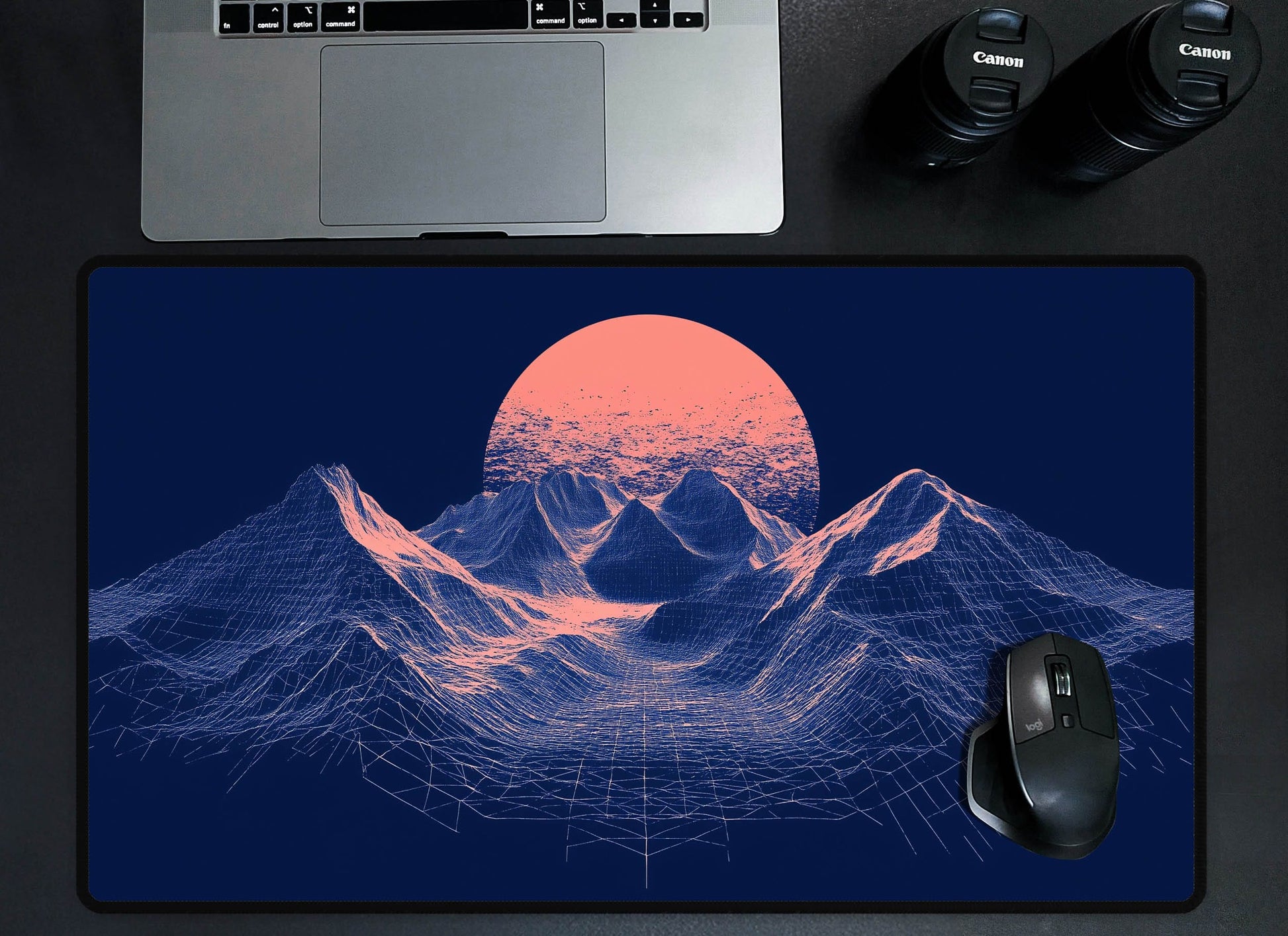 Explore the sleek and contemporary style of the Geometric Mountain Landscape Desk Mat. Designed for both work and play, this stunning piece adds a touch of modern artistry to any workspace or gaming setup.